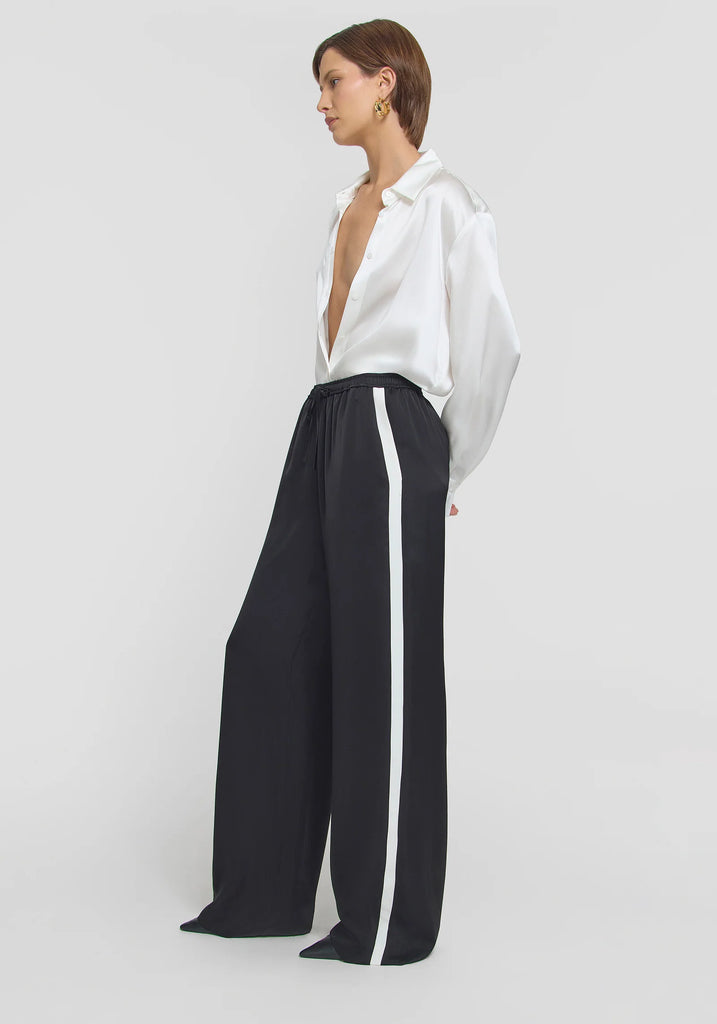 A modern take on cupro set dressing, the Rocky Pant makes a statement with an ivory panel down the side seam, adding depth to the lightweight black cupro. With a loosely tailored silhouette, wide leg, and an elasticated waistband with functional drawcord, it pairs perfectly with the Billy Top for effortlessly chic styling with an element of sportsluxe.